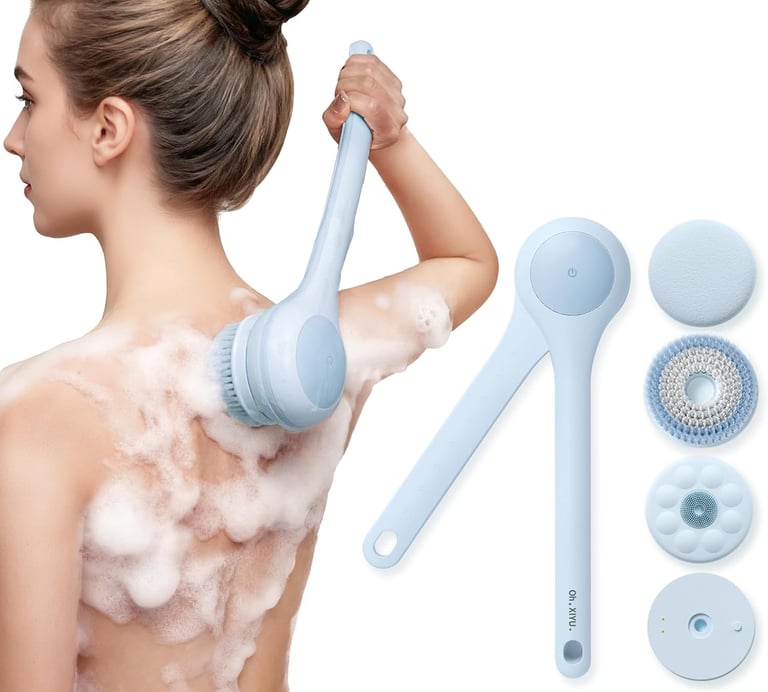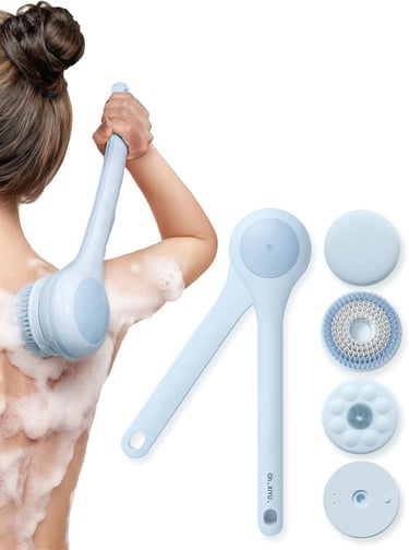 3 Types of Brush Heads: In order to meet different bathing needs, we have matched 3 standard brush heads. Long Bristle Head (90000 bristles, deep cleansing); Lotion Applicator Head (even application & soothing massage); Bath Scrub Head (preferred plant fiber fabric, soft and painless, fast exfoliation).